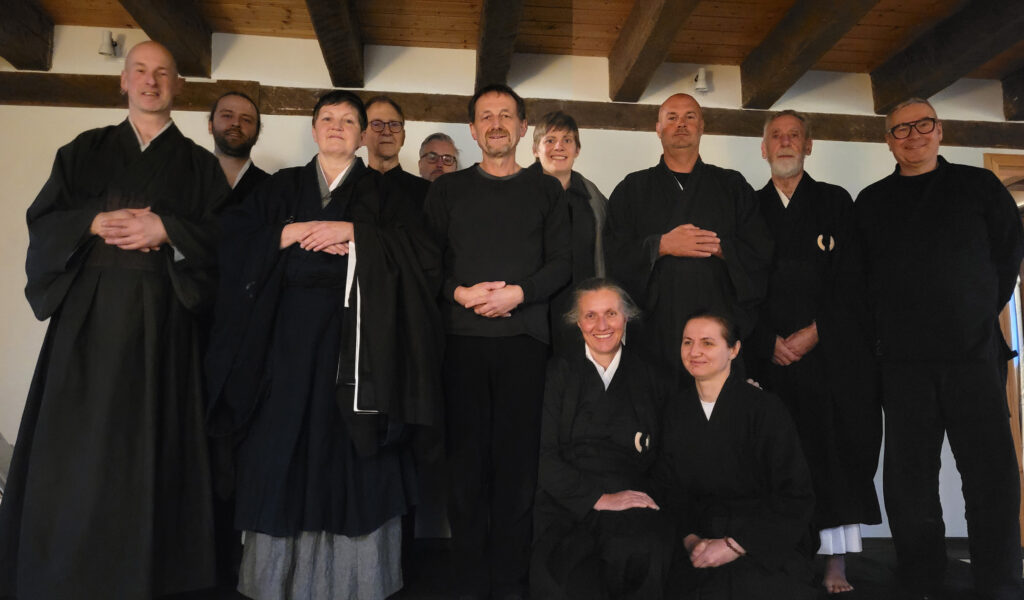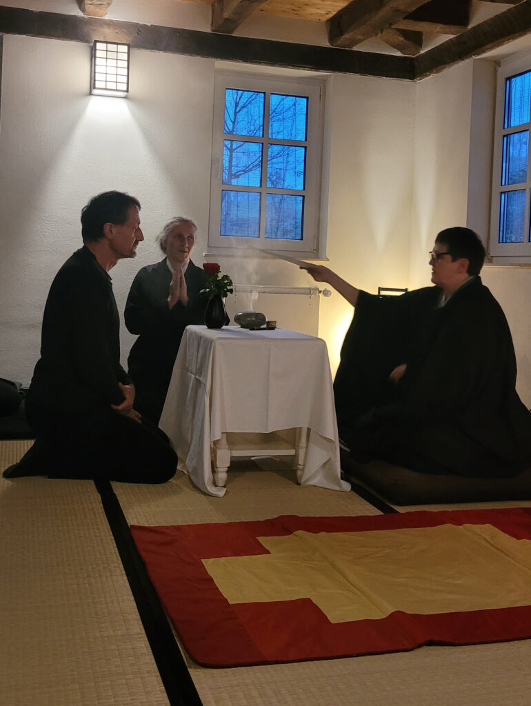 Während des Zen Tag Offene Weite hat eines unserer Sangha Mitglieder Zuflucht zu Buddha, Dharma und Sangha genommen. Wir freuen uns über diesen Schritt und das Bekenntnis zur gemeinsamen Praxis. In einer bewegenden Zeremonie hat Manfred M. Zuflucht genommen und die ersten fünf Silas/Gebote/Kai erhalten. In ihrem Teisho betonte Johanna Ho Ka, dass diese nicht als strikte Regeln zu verstehen seien, sondern uns als Leitlinien und Orietierung dienen können. Sie verglich die Silas mit unserem Tun im Garten, in dem die Arbeit nie fertig wird und wir auch keinen „perfekten“ Zustand erreichen, was immer wir uns auch darunter vorstellen mögen. Es geht um unser Bemühen und die Ausrichtung auf dem Weg, die die Silas in uns lebendig werden lassen.